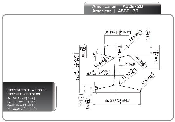 | ASCE85 | 63,5 (2 1/2") | 127 (5") | 28,6 (1 1/8") | 57,5 (2 17/64") |