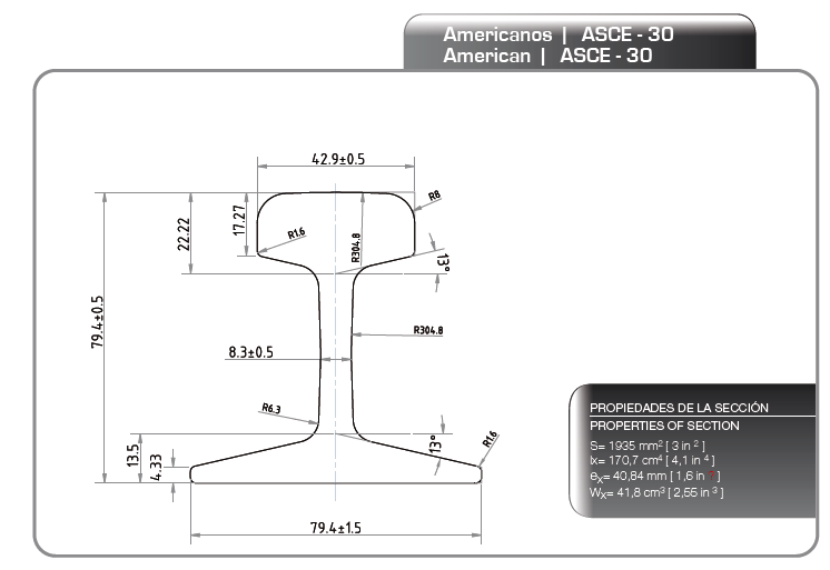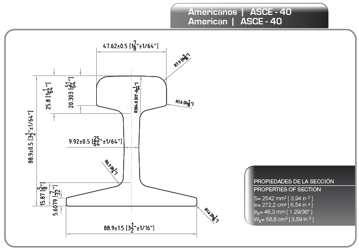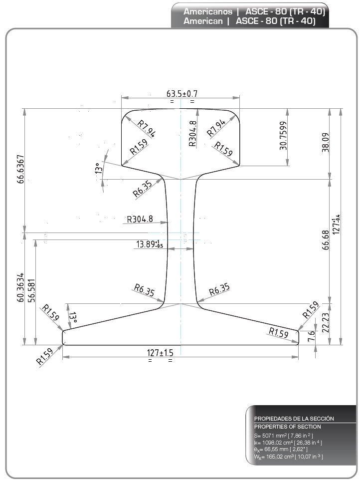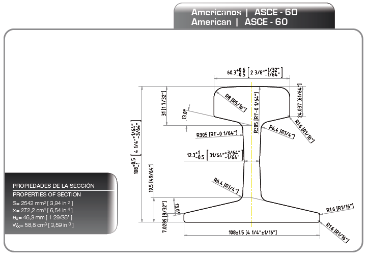 | ASCE60 | 63,5 (2 1/2") | 127 (5") | 23,8 (15/16") | 48,4 (1 29/32") |