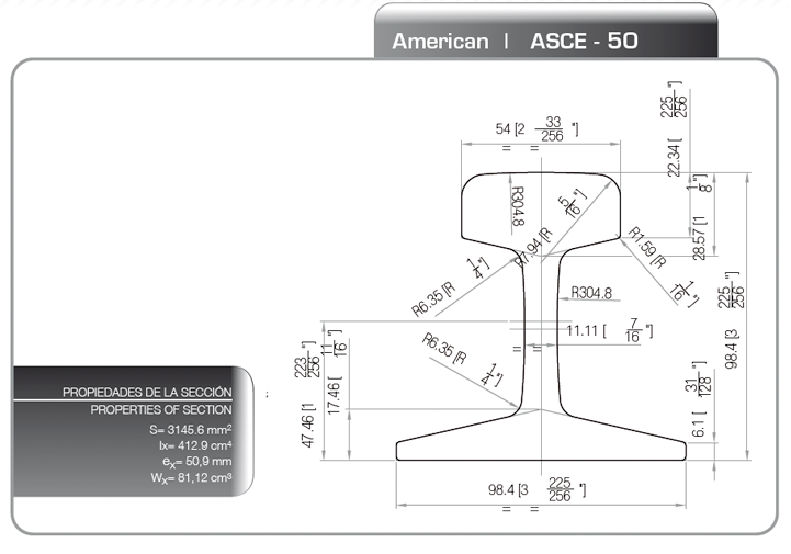 | ASCE50 | 50 | 24,65 | 98,4 | 3 7/8 | 98,4 | 3 7/8 | 54 | 1 7/8 | 11,1 | 7/8 | |