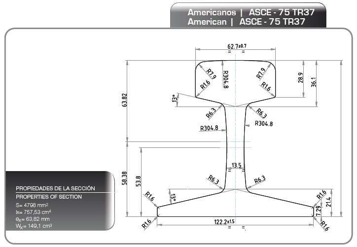 | ASCE75 (TR37) | 75 | 37,2 | 122,2 | 4 13/16 | 122,2 | 4 13/16 | 62,7 | 2 15/32 | 13,5 | 17/32 | |